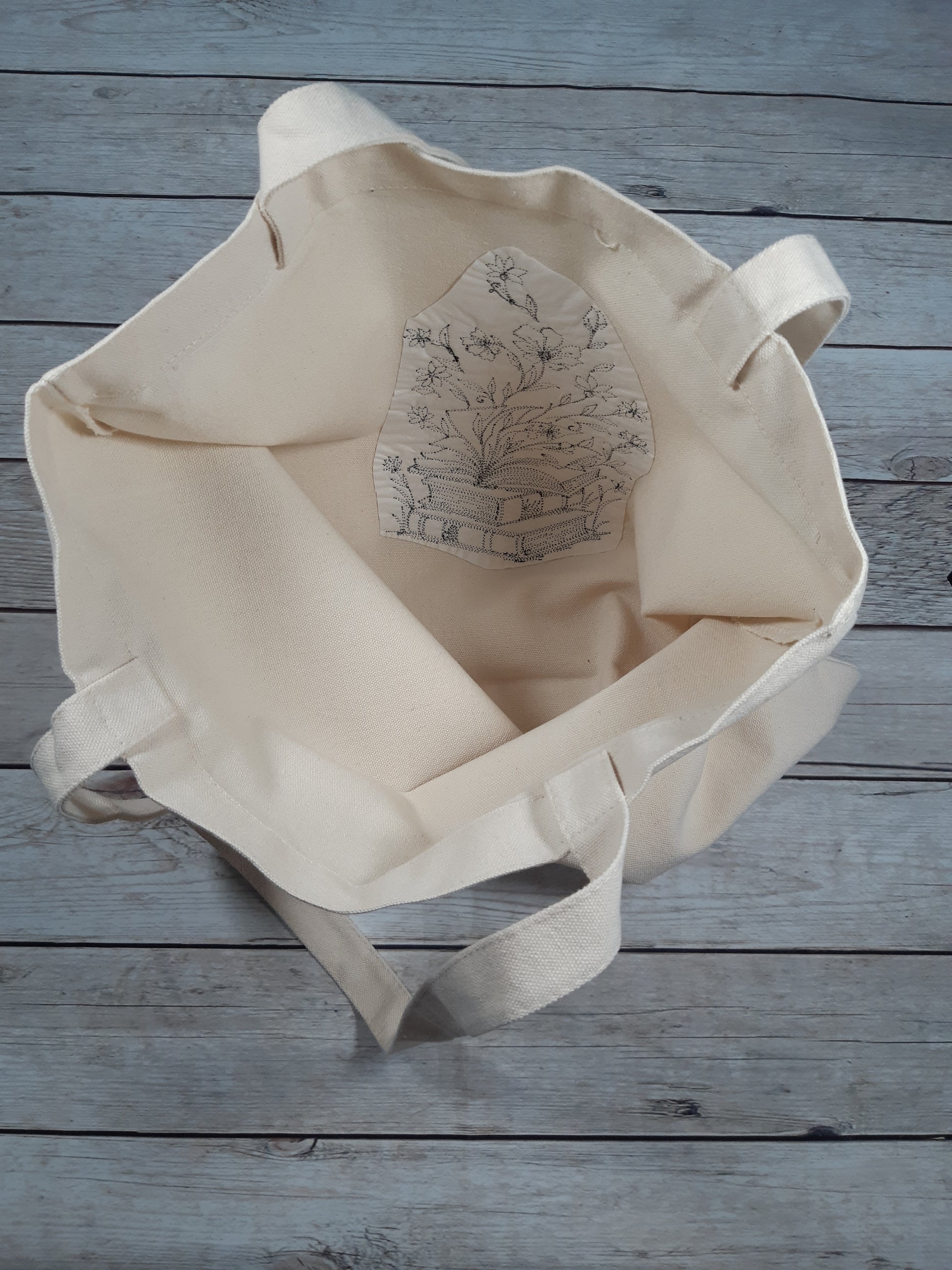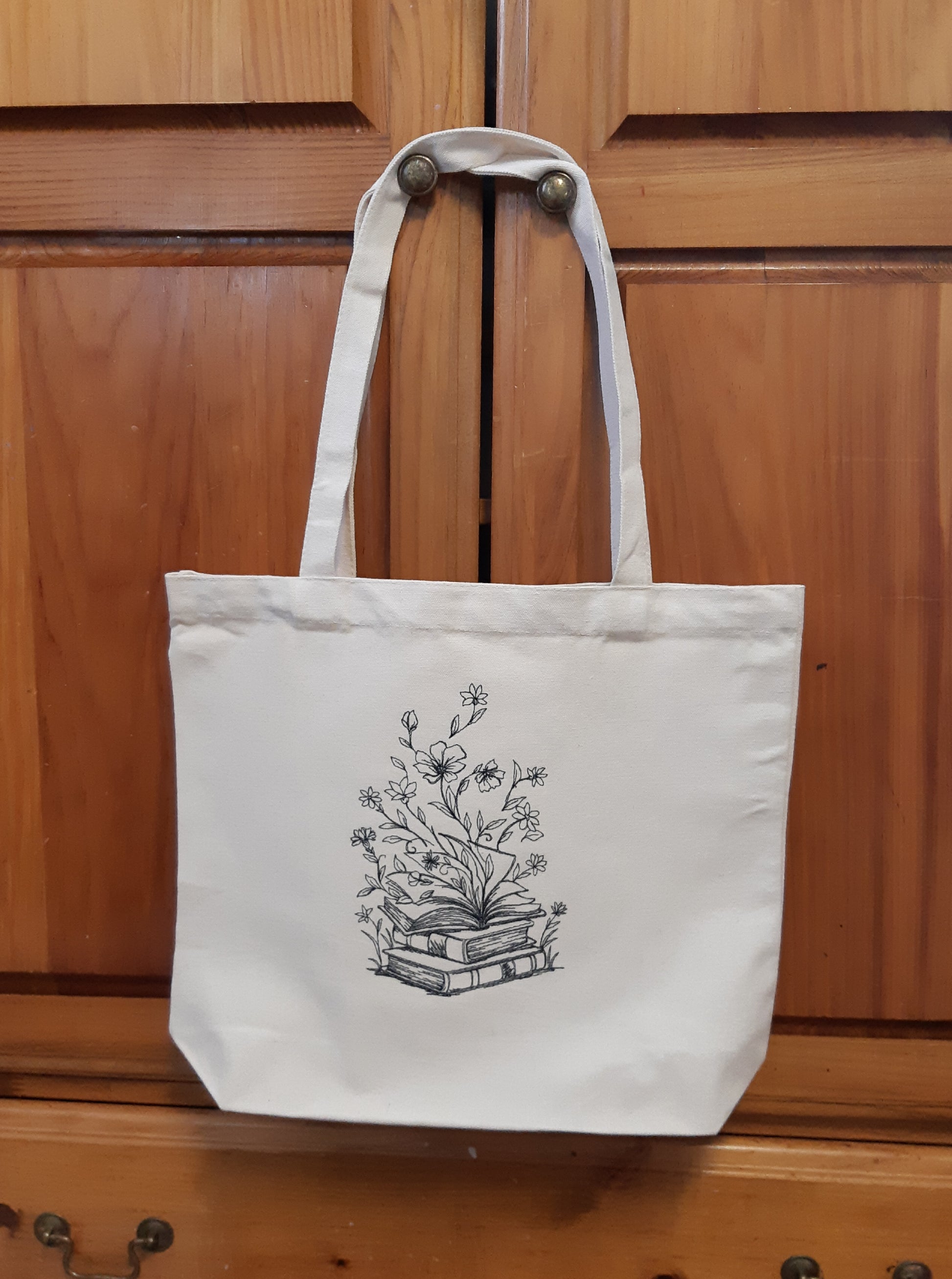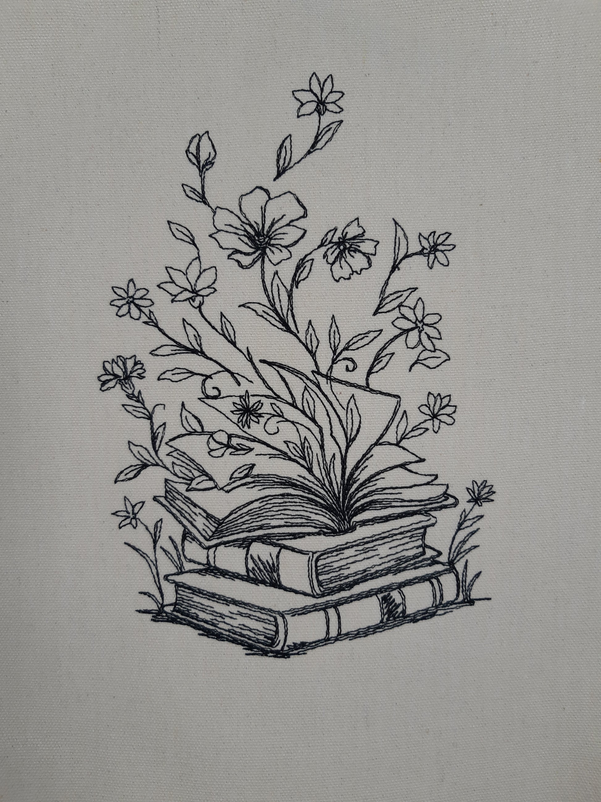 This whimsical design with flowers coming out of a stack of books is machine embroidered using over 13,000 stitches using black thread. Design is 26 cm tall by 15 cm wide or 9" by 6"