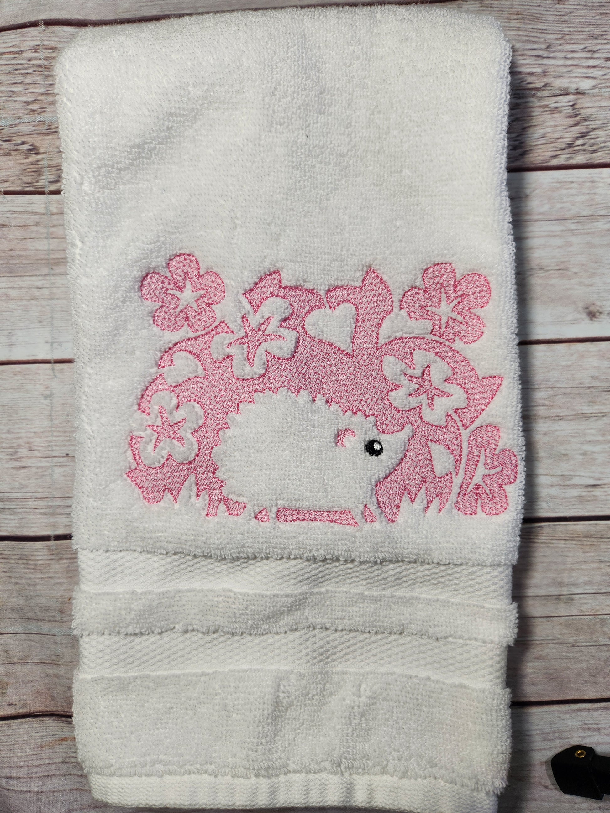 These soft, white, absorbent hand towels measure 16 inches x 30 inches and are perfect for yourself or a gift. Design is machine embroidered and measures 5.5"x5"